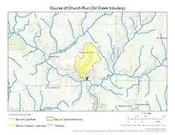 Church Run rises on the Thompson Creek divide about 2 miles north of Titusville, Pennsylvania. Church Run then flows southwest and south to meet Oil Creek at Titusville.[2]