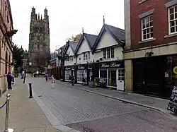 Church Street first appeared in the 1620 survey by John Norden, retaining a medieval character. In the early 18th century it was sometimes known as "Church Yard Street".[3][10][13] The name "Church Street" was first recorded in 1692.[14] The street was described by Wrexham County Borough Council as having a juxtaposition of contrasting building façades, as it contains those of the half-timbered, stucco and gable types.[10]