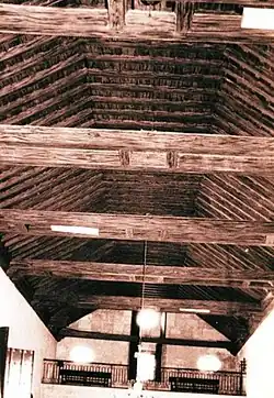 The roof of the church terminates on the interior in a wooden ceiling of paired cross-tie braces and hidden tie backs springing from every column and supported on wooden corbels. The wood cross-tie brace ceiling is a common construction in Havana and may be seen in the wooden ceiling of the Church of Santo Cristo del Buen Viaje at Amargura and Cristo Streets in Havana Vieja and Iglesia de Santa Clara de Asis[7]