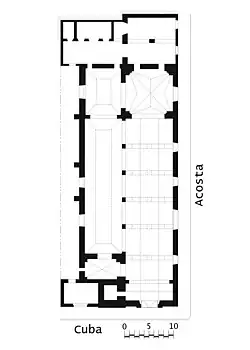 The church sits on a plinth of about 18 cm that may be seen along Calles Cuba and Acosta. The building is 60m long as measured on the exterior, east–west along Calle Acosta, although from the interior it appears that the last 10m was a later addition as the walls of this ten-meter square room are thinner (along Calle Acosta) and the roof structure does not span the ten-meter dimension. There is a column in the middle of the room to distribute the weight of the roof.