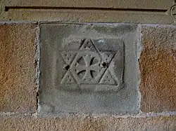 There are two tiny transepts, and the entrance of each is supported by a central pillar dividing arches echoing the design of the chancel arch and its pillared corbels. Above the transept windows and west windows are ventilation slits which are now glazed: a reminder that this is a cemetery chapel. One window of the south wall and two windows on the north wall of the nave contain stained glass. When the building was listed in 1975 it still had the original stained deal pews, but during the restoration of 2014 some of these were removed, and some were stacked in the chancel.[1] The Church of England has removed the "beautiful font of Harehills stone ... of elegant design and artistically wrought," although as of 2014 the lid still existed, hanging on its pulley. Both font and lid were carved and installed in 1871.[15]