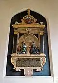 There is a monumental brass to Richard Golden (died 1446), priest at Willian 1416–1466,[4] while the walls are adorned with good quality monuments, those in the chancel being to Edward and Joan Lacon (died 1625 and 1624), John Chapman (died 1624) and Thomas Wilson (died 1656).[6] The latter is a fine and rare example. These monuments were cleaned and some were repainted in 1974. The newer of the two lecterns was given in memory of Samuel Valentine, who died in 1974; the older one was given in 1870 by Thomas Legh Claughton, the Bishop of Rochester in whose diocese Willian then lay.[4] The original 15th-century rood screen has been removed.[3][7] Above the tower arch are the Royal Arms which were probably placed there during the restoration of 1870. At the base of the tower the Ellacombe Chime bell-ringing apparatus on the wall enables one person to ring all six bells. The oldest bell in its original state is dated 1662. The organ was made by J. W. Walker & Sons Ltd in 1864, and was refurbished in 1986. The Victorian baptismal font is believed to be the fourth in the church. Its predecessor was taken to the Rectory where it was used as a plant container.[4]