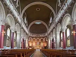 The interior decoration was entrusted in 1921 to Montreal artists Alexander Carli and Nicholas Petrucci who enjoyed an excellent reputation for statuary. In addition to the stone and marble high altar, they also made both side altars, the balustrade of the choir, the Stations of the Cross in stone from Caen coated with plaster, and above the frieze, the statues of the Twelve Apostles.