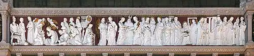 The frieze contains depictions of 320 people, life size, made of plaster or marble dust dissolved in the adhesive. Its dimensions are impressive: it measures 2.14 meters high and spans the entire perimeter of the church, just below the ceiling.