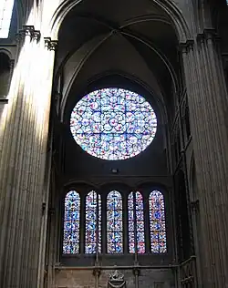 In the 13th century, the church had stained-glass windows of high quality. Only five of these, made around 1235, remain; they are the lancet windows of the north transept. These represent episodes from the life of Saint Peter (the first two on the left) and Saint Andrew (the other three).