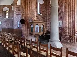 As the church had fallen into a state of disrepair by the beginning of the 19th century, restoration work was carried out first from 1867 to 1871 under the leadership of architect Vilhelm Tvede (1826–1891) when the central tower was rebuilt. Later from 1917 to 1921 the three entrances and the windows were reconstructed under architect Mogens Clemmensen (1885-1943) and his father Andreas Clemmensen (1852-1928). From the square nave, four arms of equal length stretch out to a polygon terminal. These proportions have been compared to the description of the New Jerusalem in the Book of Revelation.[3] While the original barrel vaults of the transepts are still in place, the columns in the nave and the vaults have been reconstructed. The medieval sacristy (1400) along the north wall of the chancel is well preserved. In about 1500 it was given an upper storey. [4] [5]