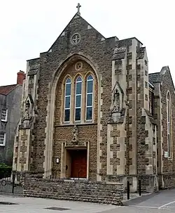 The church sits along Magdalene Street facing the medieval Abbot's Kitchen across the road in Glastonbury Abbey. On the same site once stood the original Catholic church in an old converted stable, which was pulled down in 1938.[2] Behind the church there was once the St Louis Convent school, which operated from 1925 until 1984.[3] The new church was made at a cost of £11,000 and was built using Bath and Corsham stone. At the front of the church, carved into the stone, are statues of the Madonna and Child, Saint Dunstan to the left and Richard Whiting, the last abbot of Glastonbury, on the right. Father Michael Fitzpatrick worked on raising these funds and relied upon local donations to do so.[4]