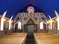 The building's simple exterior, with its wooden siding, steep pitched roof, lancet windows and lancet entranceway under a steepled bell tower, make it a rather plain example of Carpenter Gothic style architecture, which belies the extraordinary painted decoration of its interior.[1][2]