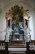 The altarpiece is the work of Nicodemus Tessin and depicts a scene from the Garden of Gethsemane between two columns, where Jesus is comforted by an angel while another angel hangs in the air beside them, carrying the golden chalice. On each side, two figures of Pietas and Justitia illustrate the King's motto. The two columns carry a broken, curved architrave and gable. Behind the opening of the broken gable is placed a pane with Jahve's name in Hebrew inscribed and lit from behind. Around the pane is an arrangement of gilded beams and cloud formations.