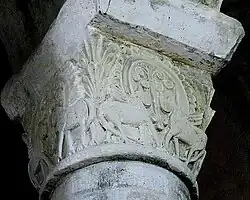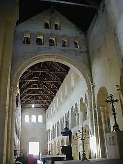 The church follows the traditions of basilicas of the high Middle Ages but experiments with a three-level elevation with a clerestory. The column capitals exhibit simple sculpture which would later be elaborated.