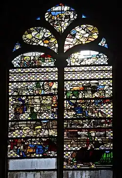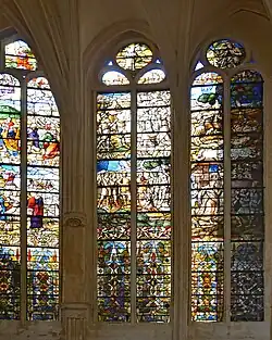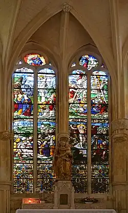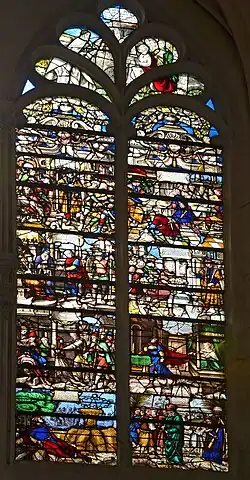 In 1523,[3] the apse of the church collapsed[5] due to a lack of maintenance.[3] Its re-construction started in 1530, maybe as a part of a reconstruction project of the whole church.[5] The new apse was built in the Renaissance style. The glass walls were remarked, notably the ones of the 1530 axial chapel dedicated to the Virgin Mary as well as the ones of the ambulatory which show the story of saint Laurent, the secondary patron saint of the church. New stained glass windows were installed in the church, but they were destroyed during the occupation of the city by the Protestants in 1567–8. New stained glasses were installed, but they were damaged with time.