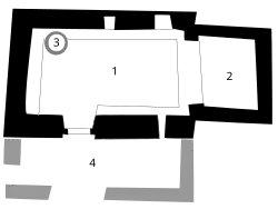 The plan of Sainte-Cécile de Cos is typical of pre-Romanesque churches in the region: oriented east/west, the building comprises a simple, approximately rectangular nave, extended to the east by a flat, trapezoidal apse whose axis is slightly offset from that of the nave. A final pre-Romanesque feature is provided by the sparse, simply splayed windows and by the location of the only doorway in the south wall of the nave.[18] The whole structure is barrel-vaulted.[31] At the level of the separation between the nave and the apse are the remains of a bell-gable, which must once have had one or two bays.[32]