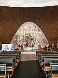 The church was controversial from the beginning. The mayor of Belo Horizonte, Juscelino Kubitschek, was the patron of the project. Niemeyer said that he was inspired by the French poet Paul Claudel's statement: "A church is God's hangar on earth", but Time magazine wrote that the Archbishop of Belo Horizonte, Antonio dos Santos Cabral, saw it as "the devil's bomb shelter".[4] Archbishop Cabral opposed both its unorthodox architectural and artistic forms, particularly the mural behind the altar of St. Francis with a dog depicting a wolf, painted by Candido Portinari.[5] He proclaimed the church "unfit for religious purposes".[4]