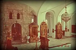 In the oldest area of the church, there is a "four-pillar cross-dome" with the facade formed by semicircular recesses built over cross-shaped columns.[7] The base of these columns are founded over marble columns which are provided with Corinthian capitals. It is inferred that this type of architectural feature existed on the basilicas built in the 6th century. Next to the western side of the church, there is a basilica which is dated between the 11th and 13th centuries.[7] A new chapel was added to the church in the 19th century, which was followed by enlarging the basilica with stone works, and with a belfry. The narthex, which existed in the old church, has been demolished. The building material used in the old part of the church is light Kerch limestone. The walls of the church have been built with bricks in successive layers, laid in alternate stages of four layers of masonry followed by four layers of red clay bricks which act against earthquake effects. However, in the new extensions made to the church this seismic proofed type of wall construction is not evident. The old part of the church has withstood the vagaries of weather conditions.[7] The interior of the church contains murals from the 13th–14th centuries.[10]