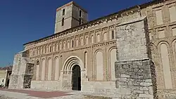 In front of the main door, and to the left side of the sacristy, we find a stone lobed arch that immediately reminds us of the Mosque of Córdoba, of clear Muslim influence. It does not belong to the complex, and taking into account that the council militias of Cuéllar participated actively in the reconquest of Andalusia,[5] it is possible that it was brought to the town as spoils of war.[6]