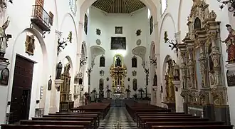 A new church building was constructed in the 16th century to replace the mosque structure.[8] Initially, in the first decades following its consecration, the building was expanded with the addition of new rooms and of a new lateral entrance.[7] The new entrance portal was completed in 1543 by Esteban Sánchez under the direction of Diego Siloe.[7] In 1565, work began on replacing the old building entirely. First built was the chancel, which was completed in 1592. It was designed by architect Juan de la Maeda, a student of Siloe, and executed by stonemasons Juan Martínez (up to 1576) and Juan de la Vega (after 1576).[7] The church's bell tower was also completed around 1592 and is attributed to architect Ambrosio de Vico.[7] By the end of the century, the rest of the mosque was demolished and work on the new nave was carried out around 1610. The northwestern portal, leading to the cloister, also dates from the 17th century.[7] Construction work was slowed considerably by the economic devastation caused by the Morisco rebellion of 1568 and the subsequent expulsion of the Moriscos from Granada, which depleted the neighbourhood's population (which was largely composed of Moriscos until then). This also caused the building itself to be completed with a less ambitious architectural design than initially envisioned.[7]