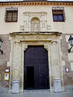 The main entrance portal on the northeast side, still dates from 1543. It reflects the ornate Granadan Plateresque style of Diego Siloe, as well as the greater architectural rigour of construction prior to the city's economic crisis later that century.[7] It was restored in 1996. The niche above the door contains a stone replica of what was previously a wooden sculpture of the Virgin and Child.[7]