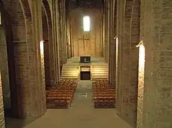At the crossing, the nave meets the transept, which is actually slightly wider than the nave. The transept, however, is short, barely emerging from the sides of the church, but still giving the structure a typical cruciform plan. Beyond it, the aisles of the church terminate in three apses, each sized according to the size of the aisle.