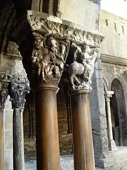 The scenes of Christ's childhood can be are read on the capitals from north to south; the Annunciation, the Visitation and the Nativity on the first capital; the next capital shows the coat of arms of Arles and an eagle with spread wings, the symbol of the Holy Roman Emperor, who at the time ruled Arles; the third capital shows the Annunciation to the shepherds, with two startled goats climbing the Tree of Life.