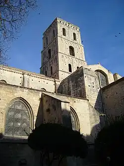 The Church of St. Trophime (French: Cathédrale Saint-Trophime d'Arles) (Trophimus) is a Roman Catholic church and former cathedral located in the city of Arles, in the Bouches-du-Rhône Department of southern France. It was built between the 12th century and the 15th century, and is in the Romanesque architectural tradition. The sculptures over the church's portal, particularly the Last Judgement, and the columns in the adjacent cloister, are considered some of the finest examples of Romanesque sculpture.