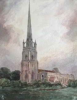 In the 14th century the building was enlarged: the south aisle was created, incorporating the earlier south transept; an extra bay was added to the chancel which comprises the present sanctuary; the lady chapel was built on the south side adjoining the chancel; the tower and spire were built. The church seen today is essentially the building of this period.[1][4]