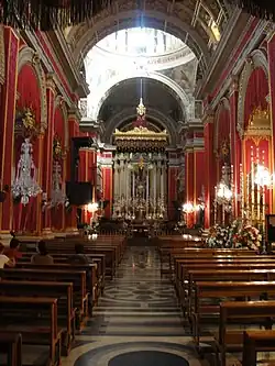 The original parish church of Żurrieq is first mentioned in 1436 by Bishop Senatore de Mello who was commissioned to do an inventory of the parish churches in Malta.[1] The church was mentioned again in 1575, in a report by inquisitor Pietro Dusina. Considering the increase in the village population, in 1630 the then parish priest, Antonio Demos, started to plan for the building of a new church. The building started in 1632-1633 under the direction of Reverend Matteolo Saliba, who was also the architect of the new church. The church was completed in 1658 after 25 years.[2]