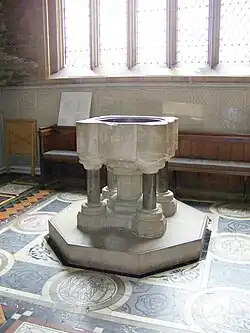The interior is elaborately adorned with sculptures and stained glass, most of which is by Charles Eamer Kempe.[5] The font was recovered in the nineteenth century from under the floor at the West end of the church and restored, at first in the middle of the nave and then moved by Bennet to the Chapel of St Nicholas which became the baptistry. It is surrounded by a pavement by Clayton & Bell showing the seven virtues and seven deadly sins.[10] A font which had been in use in the present Ken Chapel in the early nineteenth century was given to Christ Church, Frome, after its construction.