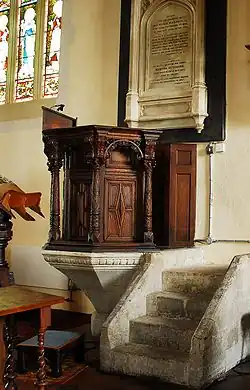 In 1724 work began to change the church roof from tiles to lead, work that was completed in 1758; until this point the church had a three-span roof but this work saw the roof assuming the one-span structure that is maintained to the current day.[22] In 1742 the plain window on the northern wall behind the pulpit was replaced "with a Square Crown Glass in order to give it better light, and also to alter the Sounding Board in such a manner as shall be thought most proper upon the opinion of the Revd. Mr. Smith, Vicar, and the workman."[22] According to Couper, the housekeeping records during this century became "more meticulous than ever"; records were kept of the monies received for each member of the congregation ("1/- for each person 'seated' in the Church or Churchyard, and 3/4 for a child's")[23] as well as for items such as "a pound of soft soap" (7d), "oyle" (3d) and "a chamber pott" (9d).[23]