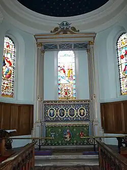 The parish's war memorial is a wooden triptych with a crucifix in the centre, above the Latin mottos "AMOR VINCIT" (Love conquers) and the town motto, "FIDELITAS URBIS SALUS REGIS" (In the town's loyalty lies the safety of the King) and listing its war dead from both World Wars.[2]