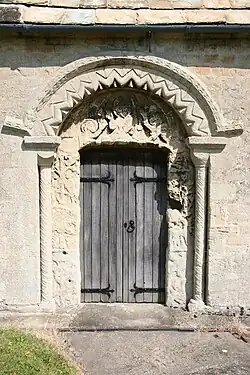 The church has a notable Norman tympanum over its south door.[4][7] The tympanum has a carving of Christ in Majesty with angels.[8] The door of the church probably dates back to the 12th century[3] but some suggest it is Anglo-Saxon.[9]