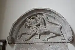 The Samson Tympanum, installed from the old church, is a particularly notable feature. It is situated is above the door to the tower, opposite the south door. A relief carving shows Samson astride a lion and forcing its jaws open. It is thought to have been created by a medieval sculptor known as the Chief Master, working under the patronage of Ralph de Baskerville.[2][3][4]