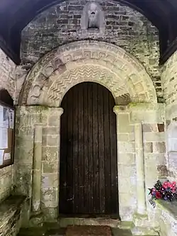 The south aisle has five bays to the nave and is fitted with Decorated-style windows with the string course continuing above the 16th-century stone chamfered and carved pointed-arched priest's door. The gabled porch dates to the 15th-century while an 18th-century sundial is fitted above the 15th-century doorway. Inside the porch a 14th-century stoup can be found to the right while an image niche above the Norman doorway dates to about 1200. This doorway is decorated with a round arch of three orders with carved beakhead and chevron ornamentation.[3]