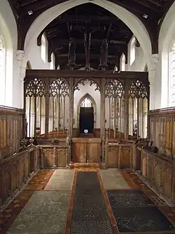 The rood screen is mainly late medieval, and is in five bays with the extra-wide middle bay being the entry. It has been much altered. The oldest parts are thought to have been in position after the restoration in the 1480s. Traces of the medieval paint colours of red, green, cream and gold still remain. At that time there would have been a small winding staircase (a vice) leading up to the top of the screen from behind the present pulpit. The doorway to the screen is still visible but the vice was bricked up in the Reformation. However the remains of the first few steps of the vice can be seen besides the modern pulpit.[4] The cornice infilling above the heads of the lights and gates are modern. In the north chapel can be found three remodelled pews, with an additional pew-end incorporated into modern seating. In the south chapel can be found two blocks of seating, each of four pews, similar to the seating in the north chapel but with original panelled fronts to the first pews. Nearby at the east end of the south aisle is a third panelled front incorporated into modern seating. With the exception of the first these seats are late medieval.[1][2]