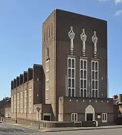 St. Monica's is a Roman Catholic parish church in Bootle, Merseyside. The church building was designed by the architect F. X. Velarde. Construction was started in 1930 and completed in 1936, and the church was dedicated by Archbishop Richard Downey on 4 October that year. It is a brick structure with a green glaze pantile roof, and is a Grade I listed building. The church is inspired by German churches of the 1930s. Three sculptures of angels were sculpted by H. Tyson Smith. Other sculptures include winged creatures.[1] The current priest is Father Ged Gallagher who has been at the church since 2019 after he succeeded Father Pat Sexton. 53°27′14″N 2°58′48″W / 53.454°N 2.980°W / 53.454; -2.980