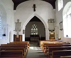 St Nicholas' has an aisleless nave with a late 19th-century panelled roof supported on four 15th-century carved wooden corbels. In the splay of the North nave window and in the south-east corner of the nave are two unusual canopied niches. Beside the north window is a 14th-century spiral staircase, now blocked at the top, which originally led up to the now lost rood screen. The west arch is of about 1350 and has semi-octagonal shafts. The original chancel arch was demolished in about 1440 and a mis-shaped replacement was built about 2 ft further east. The clerestory was raised at the end of the 15th century, and a new low-pitched roof was installed above it. The chancel has a panelled ceiling with simple bosses, while the stained-glass windows are mid-19th century.[4]