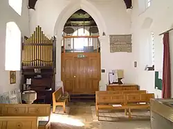 Two monumental brasses can be found in the chancel, with that high on the north wall being mid-15th century and believed to be the figures of Simon Ward, 1453, and his wife, 1481; that on the floor of a man, woman and six children is said to be of John Lambard, Alderman of London (died 1487), the eldest daughter was supposedly Elizabeth (better known as Jane Shore, mistress of Edward IV of England).[5][6] The pulpit is mid-18th century with fielded panels, near which is a 16th- or early 17th-century Rector's chair. The small octagonal baptismal font in the west is mid-19th century. There are six bells with the treble by Mears & Stainbank (1908); the second by John Briant of Hertford (1820); the third and fourth by Miles Graye (1651); and the fifth and tenor by John Briant (1825 and 1820).[4][7] These bells and the tower were restored between 1981 and 1986 with money given in response to a BBC Radio Appeal by author Monica Dickens, who had lived in the village before her marriage, and with funds raised by the Friends of the Church. The church has been Grade II* listed since May 1968.[1]