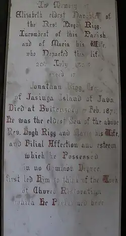 Reference to a church at Patric Brumpton [sic] was first made in the 12th century,[3] though it is believed that a place of worship had existed on the site for some time before that.[4] The present church structure is largely from the 12th, 13th and 14th centuries, though there have been some modifications, alterations and additions over the years.[5] The church, which is now a grade I listed structure, underwent a restoration in 1864, financed by Jonathan Rigg, son of the incumbent Rector, Hugh Rigg and owner of a tea plantation at Jasinga in Java (modern Indonesia). An attribution to the renovations appears on a marble memorial stone (see image in sidebar) at the rear of the church, adjacent to the door and the initials JR appear in the stone arch over the front entry.[6][7] It is only one of two Anglican churches in Yorkshire which are dedicated to St Patrick,[1] (the other being St Patrick's Church, Patrington).[8] However, the dedication is first referred to in 1230, and may be in honour of Ghile Patraic (sometimes styled as Gilepatric and Gille Patraic) (possibly a feudal name: [1]), who was a landowner at the time of the conquest.[9] One source states that a carved niche in the chancel used to hold a statue of St Patrick.[10]