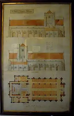Swatman called a meeting at the end of the war in November 1918 to discuss building a permanent church which was attended by 28 people who donated £29 5s. In 1919 the Diocese of St Albans bought a piece of land bought from the First Garden City Company. Swatman now had a site on which to build a church. It was decided to build a 'Victory Church' a functioning church which would also function as a memorial of the victory at the end of World War I. The architect Arthur Heron Ryan Tenison (1861-1930) was commissioned[3] to produce a design described by Nikolaus Pevsner as "an ambitious project... A conventional Decorated Gothic style was adopted with flint walls and stone dressings with conventional gothic traceried windows." Tenison's design for the church was accepted for exhibition at the Royal Academy of Arts in 1921. A Garden City 'Victory' Church Appeal was launched in 1921 which by October had raised £2,000. At this time it was decided that the new church would be dedicated to St Paul.[4]