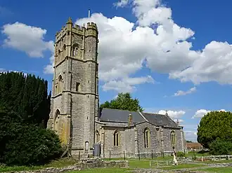 It has a three-stage Somerset tower, dating from around 1468,[5] supported by pairs of full-height corner buttresses. The south-east octagonal stair turret leads to an outer door.[1]
