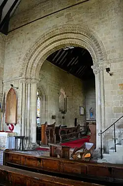 The 12th-century chancel arch is elaborately decorated, having three orders on the nave side and two on the chancel side: there are varieties of chevron patterns; the capitals and abaci have ornaments of grotesque figures and foliage.[3]
