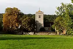 The nave and chancel appear to have been constructed on a continuous foundation of large blocks, some of which are sarsen. The original opus spicatum masonry is made from whole flints, ironstone (from the Folkestone Beds) and Kentish ragstone. The dressings are made of tufa and the rere-arches of the original windows are greensand. Bath stone, Portland stone and brick was used for repairs in the 18th and 19th centuries while cement and thin tiles have been used for more recent repair work. The west end of the nave has a doorway and lancets that probably date from the 13th century. The chancel is only slightly smaller than the nave and there is no chancel arch. The western window on the south side of the chancel is unusually far to the west and has been rebuilt externally. The nave and chancel have a continuous rafter, collar and soulace roof that may date from the 14th century. The south wall of the nave adjoins the north wall of the tower.[3][10]
