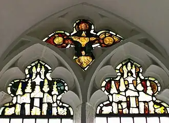 The church has a wide selection of stained glass. The original glass in the tracery of the north nave window consists of canopies with a quatrefoil above that depicts a figure of the Trinity.[10] The stained glass in the west window is by Ward and Hughes and dates from 1885. The late twentieth century stained glass by Keith and Judy Hill depicts Bishop Gundulf.[12]