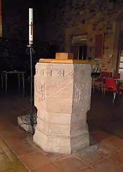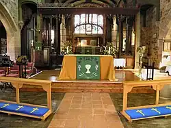 The church is built of squared red sandstone rubble with stone dressings. It features Delabole slate roofs with gable ends. The nave and chancel have narrow aisles which are flat-roofed to the north. The asymmetrical placed transeptal tower stump is covered with a saddleback roof. The north aisle was completed in 1965 due to a lack of funds previously.[4] The aisles have low three-light windows. The chancel is slightly narrower than the nave and has three-bay arcades and a waggon roof with carved corbel bosses at the east end. There is an elaborate wooden chancel screen with grille; the octagonal baptismal font with fleuron decoration dates to 1916. The pulpit is slightly earlier, dating to 1914. The sedilia has quatrefoil windows to the chancel of two seats and the piscina to left has a scalloped base.[2][6]