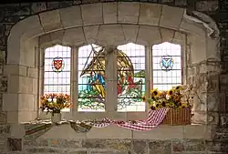 Among the stained glass windows are those by the studio of Charles Eamer Kempe and Archibald Keightley Nicholson[2] which variously depict the legend of St Sabinus being shipwrecked at Woolacombe Sands and which was installed in 1969 in memory of Royal Marine commando Ernest John "Jack" Watts (1925–1946); the window dedicated to the Colville Family was installed in 1969; the War Memorial Window installed in 1919 and produced by the Kempe studio; the Nutman Window is the work of Archibald Nicholson and is dedicated to William John Nutman, captain of the SS Aidar, who received the Albert Medal, first class from Queen Victoria for his great gallantry in saving the life of an injured crewman during a storm in the Mediterranean Sea on the night of 19 January 1896.[7][8]