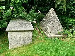 Grave markers in the churchyard date to the seventeenth century.[9] There are numerous mounds in which bodies were buried one atop the other; in keeping with medieval custom, these double burials were always on the south side of a church "as no-one wanted the shadow of the Church to fall on his grave".[9] According to legend, a pyramidal tombstone in the churchyard was contrived to prevent the deceased's wife from dancing on his grave.[9]