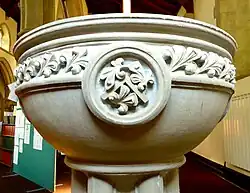 The font and pulpit, designed by the architect and sculpted by Charles Mawer of Leeds,[16] are made of Caen stone, and were paid for by Lady Ingilby. The nave and chancel originally had plain brass gas lamp standards made by Hardman's Works, and there was hot-air heating apparatus supplied by Grundy. The books were given by Mrs and the Misses Lloyd of Hazelcroft. Plate used for communion service was given by Mrs W. Strother, and the chairs in the chancel were given by Mr H. Cautley. The surplices and linen were given by the vicar of Killinghall Reverend R.K. Smith and his wife.[1] Thomas Strother presented the altar in memory of his mother who died in 1863. Dinah Cautley (d.1910) paid for the oak chancel screen in 1905.[15]