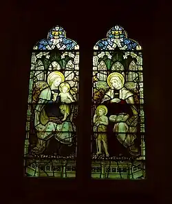 The two-light window at the east end of the north aisle represents Mary and Martha of Bethany, mentioned in Luke 38–42. In that story, Mary is interested in spiritual matters, whereas Martha prefers to do practical work. Thus Martha has a housekeeper's attributes of a spinning wheel and a purse at her waist, while Mary is praying and reading the Scriptures. This window is dedicated to Ann Mitchell, the village postmistress, by her husband.[15][23] The three-light window on the north aisle carries the theme of evangelism and music. It shows King David in the centre light, playing music. The left-hand light carries the words, "Their sound is gone out unto all lands," and the right-hand light says "and their words into the ends of the world." This is a translation of the 4th and 5th lines of Psalm 19, as it appears in the Book of Common Prayer: day 4, morning prayer. The men on either side of David are both saints with halos, and churchmen, wearing mitres. The dedication for this window is missing, but it was said by a local newspaper to have been given by William Clapham Cautley,[1] and that it is dedicated to George Thomas Woods of the Order of Saint John. Woods was church organist for 24 years.[15][23]