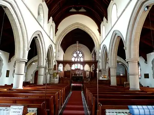 Between the nave and the north and south aisles are two arcades each of four doubly-chamfered arches, supported by circular columns with octagonal capitals. The chancel floor is three steps above that of the nave. It contains choir stalls designed by the architect William Swinden Barber on either side, and in a 1905–1908 chancel reordering these were augmented by two clergy seats and two prayer desks for the choir. The original choir stalls were described in 1880 as being "plain but very solid construction", like the nave pews which were also designed by the architect. On the south side of the chancel is the organ chamber, and on the north side is the vestry which has access through the north wall and into the chancel. The chancel arch was built "as lofty as possible", being the "chief internal feature of the structure". All the woodwork is made of pitch pine, and was originally treated or varnished to appear as close as possible to its natural colour, although the roof timbers looked warmer than the pews when new. The nave is 56.5 feet (17.2 m) by 20.75 feet (6.32 m), and the north and south aisles are 56.5 feet (17.2 m) by 9.66 feet (2.94 m). The chancel is 31.25 feet (9.53 m) by 19 feet (5.8 m). The organ chamber contained no organ at first, when it measured internally 16.5 feet (5.0 m) by 10.5 feet (3.2 m). At the consecration, a harmonium was used in default of the absent organ,[1] and the church still contains a harmonium which may date back to 1880.