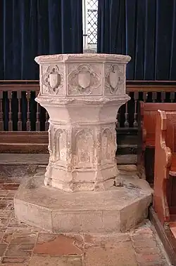 St Vincent's church was consecrated by Herbert de Losinga, Bishop of Norwich,[2] and is built of clunch rubble masonry with dressed stones visible on the stair turret. The outer walls were rendered in Roman cement during the Victorian period with scribed lines intended to imitate ashlar. The chancel is 31 ft. 3 in. by 12 ft. 7 in., the nave 48 ft. 3 in. by 15 ft. 9 in., its west end is cut off at 7 ft. 7 in. from the west by an arch carrying the east wall of a small west tower, and a south aisle with porch.[3] The nave has three bays, and some of the nave walling in the church is possibly 12th-century, while the chancel was rebuilt or lengthened in the early 13th century. The South aisle and West tower date to about 1340 or earlier. From 1420 to 1440 repairs and additions to the church were made by John of Wheathampstead, Abbot of St Albans, probably including the octagonal baptismal font, the East window, the clerestory windows, the stair turret and the South porch. There are fragments of 15th-century glass in the West window of the South aisle and in the South clerestory. The church was renovated in 1881.[1][4]