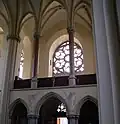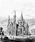 The church was built by the Latin Archbishop of Lviv, Józef Bilczewski in the years 1903–1911 as a parish church for the city's dynamically developing western suburb. It was designed by Polish architect Teodor Talowski,[1] in the neo-Gothic style, similar to that of the Votive Church in Vienna. St. Elisabeth's, placed on a hill which is the watershed of the Baltic and Black Sea, with its facade flanked by two tall towers and an 85 m belfry on the north side with imposing spires was envisioned as Lviv's first landmark to greet visitors arriving in the city by train.
